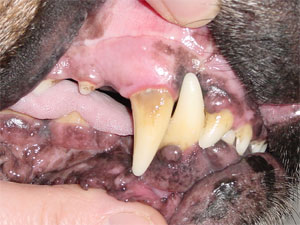 Tandsteen is op de tanden zichtbaar als bruin beslag; vaak is de onfrisse geur uit de bek van de hond het eerste dat opvalt. Tandsteen is te verhelpen door mechanische verwijdering en via hoogfrequente trillingsapparatuur (ultrageluid). In sommige gevallen is het verwijderen van bepaalde gebitselementen nog de enige oplossing.
